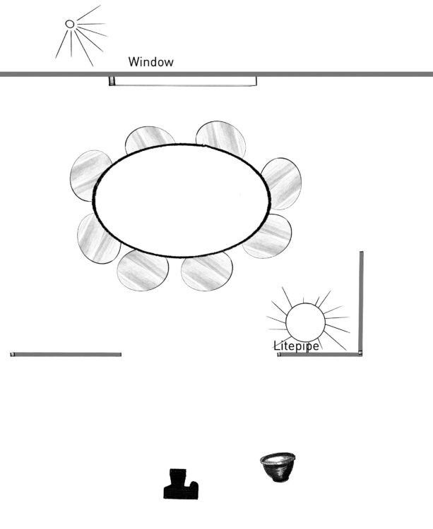 Der hölzerne Rahmen des Bildes, eine Schiebetür, benötigte ebenfalls zusätzliches Blitzlicht und dies wurde durch einen indirekten P-70 Reflektor im vorderen Raum erreicht.