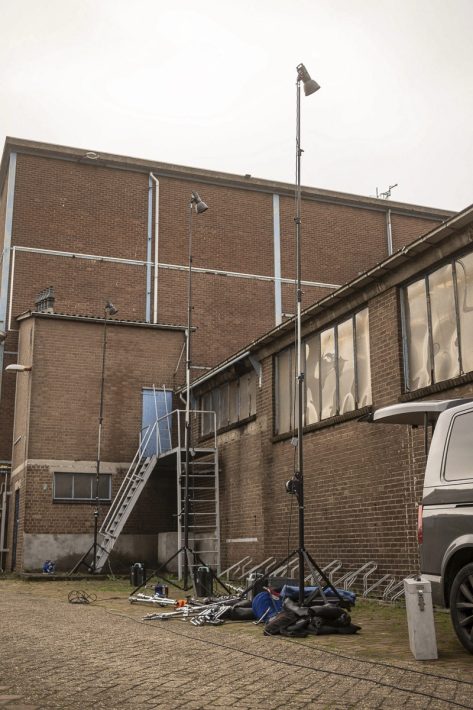 Eine der Szenen spielte auf einem interessant aussehenden Werftgelände. Als wir die Locations vor den eigentlichen Drehtagen besichtigten, stellten wir fest, dass wir – abhängig von der Tageszeit, zu der wir fotografieren mussten – nur ein Zeitfenster von etwa zehn Minuten hatten, in dem die Sonne das gewünschte Set erreichen würde. Da wir innerhalb dieser Szene jedoch mehrere Setups (Weitwinkel und Close-ups) fotografieren mussten und zudem nicht riskieren wollten, dass es ein bewölkter Tag wird, entschieden wir uns dafür, das Sonnenlicht selbst nachzustellen. Durch die Platzierung von drei broncolor Scoro Packs, jeweils mit einem Pulso 4 Kopf, hoch oben auf Lampenstativen konnten wir nicht nur die natürliche Richtung der Sonne nachahmen, sondern hatten auch die volle Kontrolle darüber, wie viel Licht auf unsere Szene traf. Diese Lichter, die durch die leicht diffusen Fenster fielen, waren letztlich die einzigen Lichtquellen, mit denen wir unser Motiv ausgeleuchtet haben.