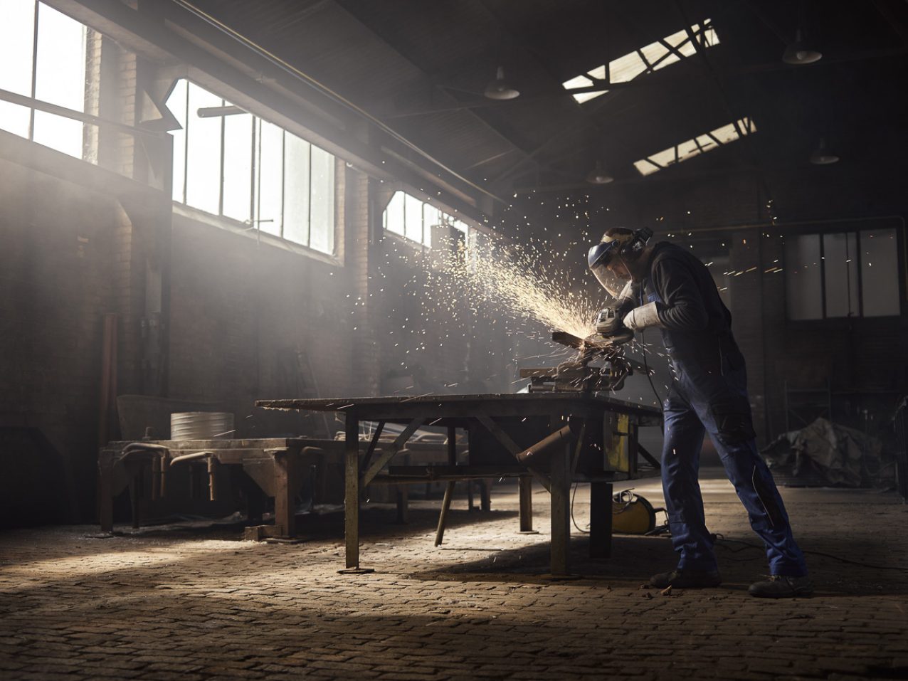 Während des Location Scouts sahen wir, wie schön das Sonnenlicht in die Werkstatt fiel, und uns allen gefiel der Effekt, den es der Szene verlieh. Aufgrund unseres Drehplans und der Verfügbarkeit der Werkstatt befand sich die Sonne jedoch am Drehtag auf der gegenüberliegenden Seite des Gebäudes. Also entschieden wir uns erneut dafür, das Sonnenlicht selbst zu erzeugen, indem wir zwei broncolor Scoro Packs, jeweils mit einem Pulso 4 Kopf, außen vor den Fenstern platzierten und nach innen leuchten ließen. Innen nutzten wir das vorhandene Licht der Leuchtstoffröhren als Basislicht, unterbelichteten es um eine Blende und schraubten die Röhren über unserem Model heraus.