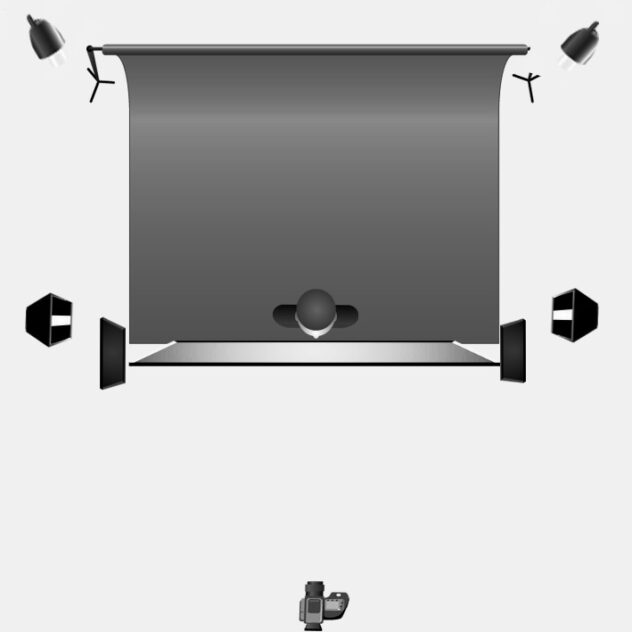 La tâche la plus difficile était d'éclairer la maquette sans heurter le rideau - sinon les fortes ombres graphiques auraient été détruites. Ce n'est qu'en utilisant deux boîtes à lumière étroites (30 x 120 cm, équipées de masques à bandes qui les transformaient en boîtes de 10 x 120 cm) que j'ai pu éclairer la lumière avec suffisamment de précision avec deux cartons à gauche et à droite du rideau. La lumière a quand même frappé le modèle (qui se tenait à quelques centimètres derrière le rideau, le touchant même parfois) mais le rideau n'a pas été touché du tout.