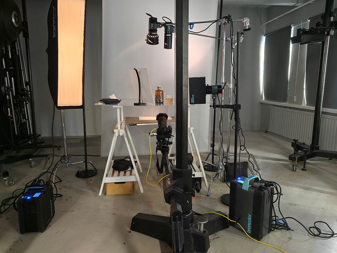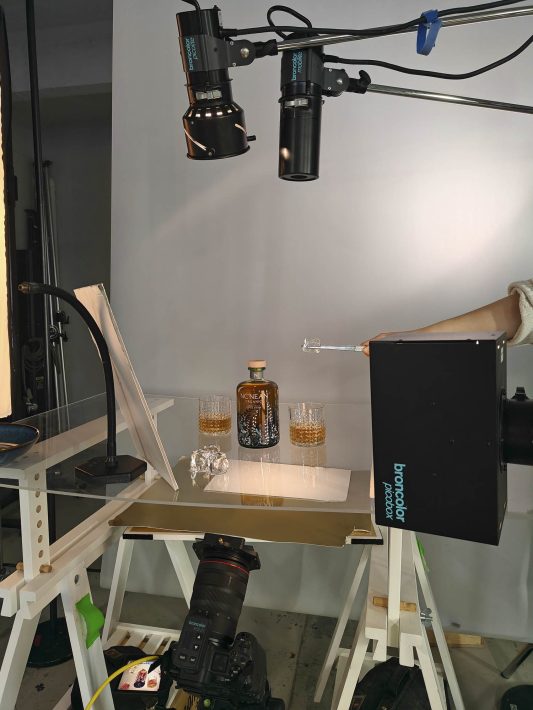 Avec autant de surfaces en verre et de liquides en mouvement, la gestion des reflets spéculaires devient un véritable défi. Les drapeaux noirs sont utiles pour bloquer la lumière, mais ils ne permettent pas d’éliminer le voile lumineux qui masque la riche couleur ambrée du whisky Nc’nean. Pour résoudre ce problème, nous avons utilisé une technique de double polarisation (ou polarisation croisée).