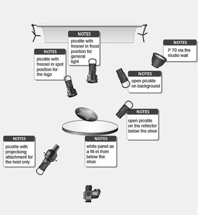 The shoe was held with wire which has been removed in photoshop for the final shot. I illuminated the logo and back of the show with a picolite from above to create some relief detail on the logo and stitching on the shoe. Another Picolite with a projection attachment allowed me to carefully control the lighting in the heel only of the shoe. A fourth Picolite came down on the front of the shoe with a controlled reflected highlight not letting it get too bright. The front edge of the sole of the shoe and leather need some light but this had to be subtle so another picolite with barn doors was directed at a sheet of white card to create a very subtle reflection on the front edge, this is barely visible unless you look closely but it was an essential part of the image that Urs and I were eventually happy with.