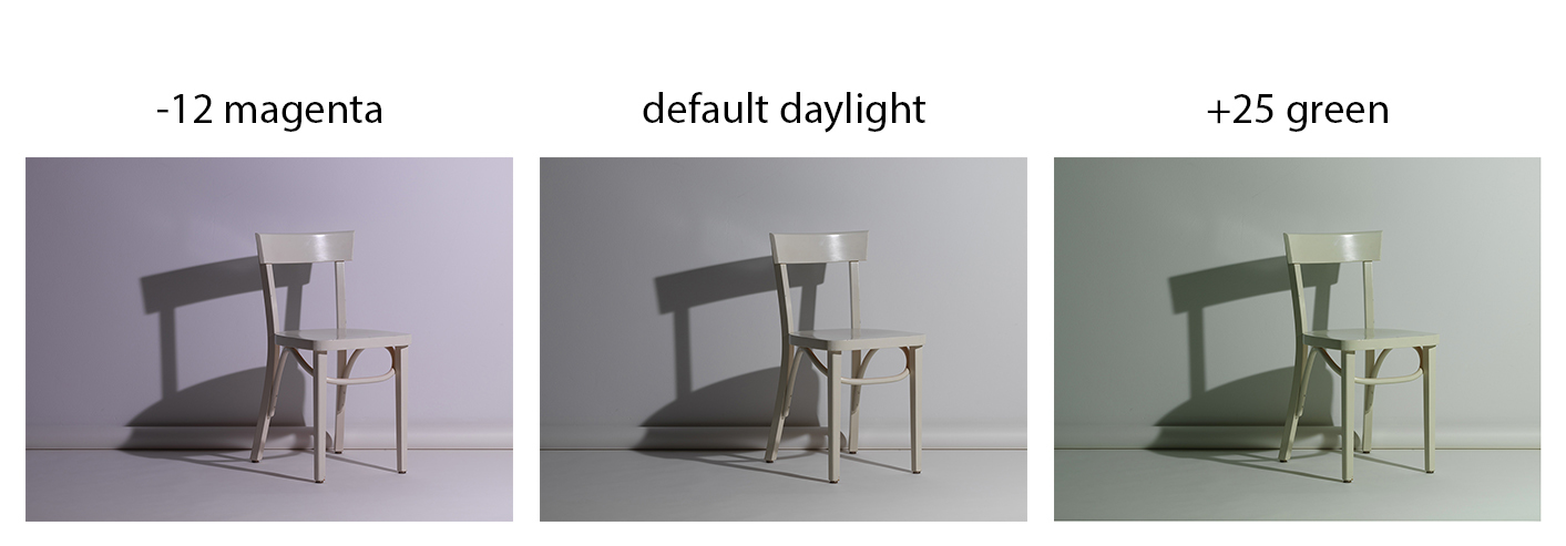 Below, you can see examples of modifications on the power output, colour temperature and green-magenta shift with the same umbrella reflector which is included in the scope of delivery: