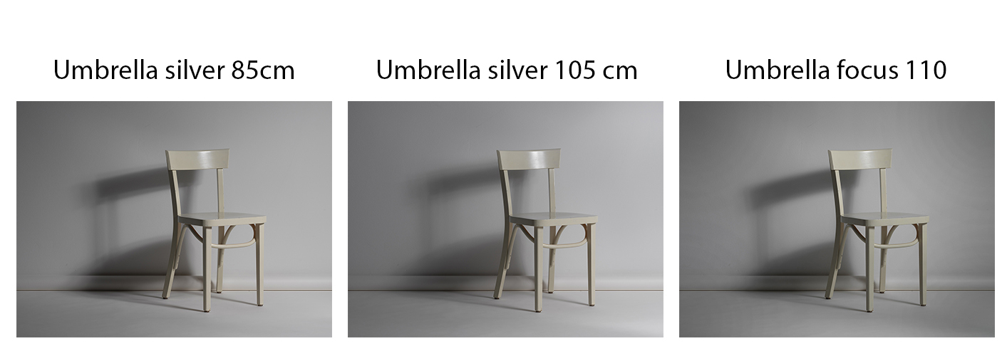 If a soft light with lots of texture is required, silver umbrellas can be your first choice. Here we show the light of three different silver-coated umbrellas – 85cm, 105cm and Focus 110: