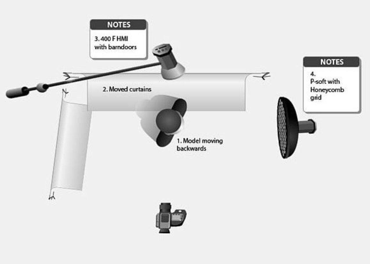 3. One 400 F HMI lamphead with an open face reflector and barn doors was illuminating the curtains behind the model, as well as her hair and some part of her shoulder from the top, backlight. With only this HMI light we would not see the face of the model as not illuminated and everything moving would be blurred because of the longer exposure time.