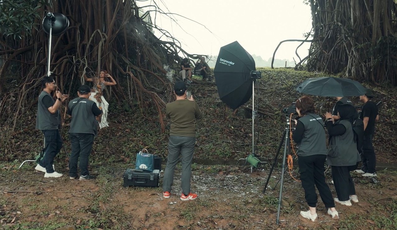 The photoshoot took place in an open outdoor area in Bogor, Indonesia, using large trees as a visual representation of the forest. Working in an open environment meant embracing natural unpredictability – shifting daylight, humidity, and changing weather conditions – while still maintaining visual consistency throughout the shoot.